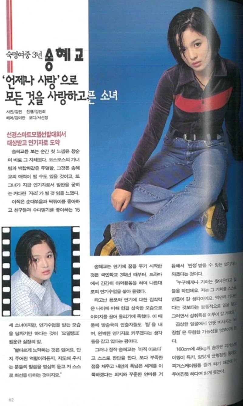 Ngoại hình xinh đẹp của Song Hye Kyo đã nổi bật giữa các bạn cùng lứa kể từ khi cô còn đi học. Trong những năm học tại trường trung học Eunkwang, nữ diễn viên là hot girl nổi tiếng và dễ dàng lọt vào mắt xanh của các nhà sản xuất.