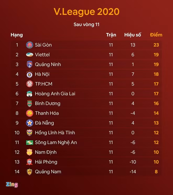 Lúc này, sau 11 vòng đấu của V.League 2020, CLB TP.HCM đang đứng thứ 5 với 17 điểm, kém đội đầu bảng CLB Sài Gòn 6 điểm.