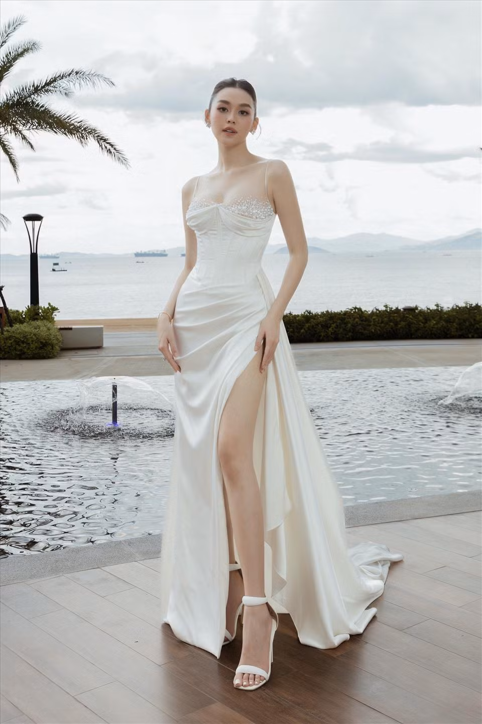 Hoa khôi Diệu Ngọc diện váy xẻ đùi quyến rũ