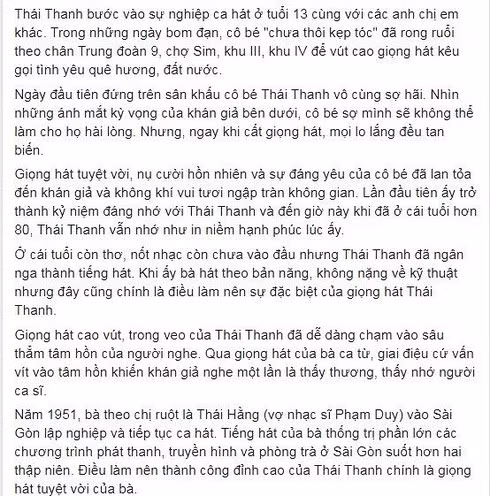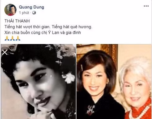 Ngày 18/3, gia đình nhạc sĩ Phạm Duy thông báo danh ca Thái Thanh đã qua đời tại Mỹ vào ngày 17/3, bà hưởng thọ 86 tuổi. Trước tin buồn này, rất nhiều sao Việt đã gửi lời chia buồn sâu sắc đến gia đình cố nghệ sĩ trên trang cá nhân: