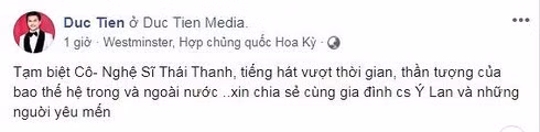 Dương Triệu Vũ chia buồn sâu sắc đồng thời đăng tải dòng trạng thái tóm tắt hoạt động sự nghiệp đầy vẻ vang của cố nghệ sĩ Thái Thanh.