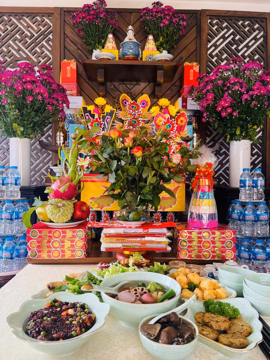 | Ngọc Hà - vợ NSND Công Lý đã chuẩn bị mâm cúng ông Công, ông Táo từ rất sớm. Cô chia sẻ: "Tiễn ông Táo về chầu trời!". |