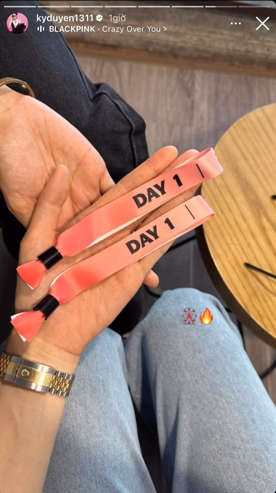 | Á hậu Kim Duyên đã thể hiện sự chịu chơi khi có mặt tại Hà Nội từ hôm qua, đồng thời trên tay còn "khoe khéo" rất nhiều chiếc vòng tay xem BLACKPINK ở khu vực VIP. |