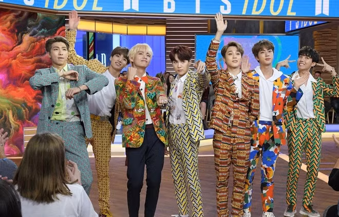 Khi "lấn sân" sang thị trường Mỹ, 7 nam thần tượng Hàn Quốc xuất hiện với diện mạo không thể nổi bật, rực rỡ hơn. Các anh chàng đều diện suit hoạ tiết bắt mắt và có phần loè loẹt.