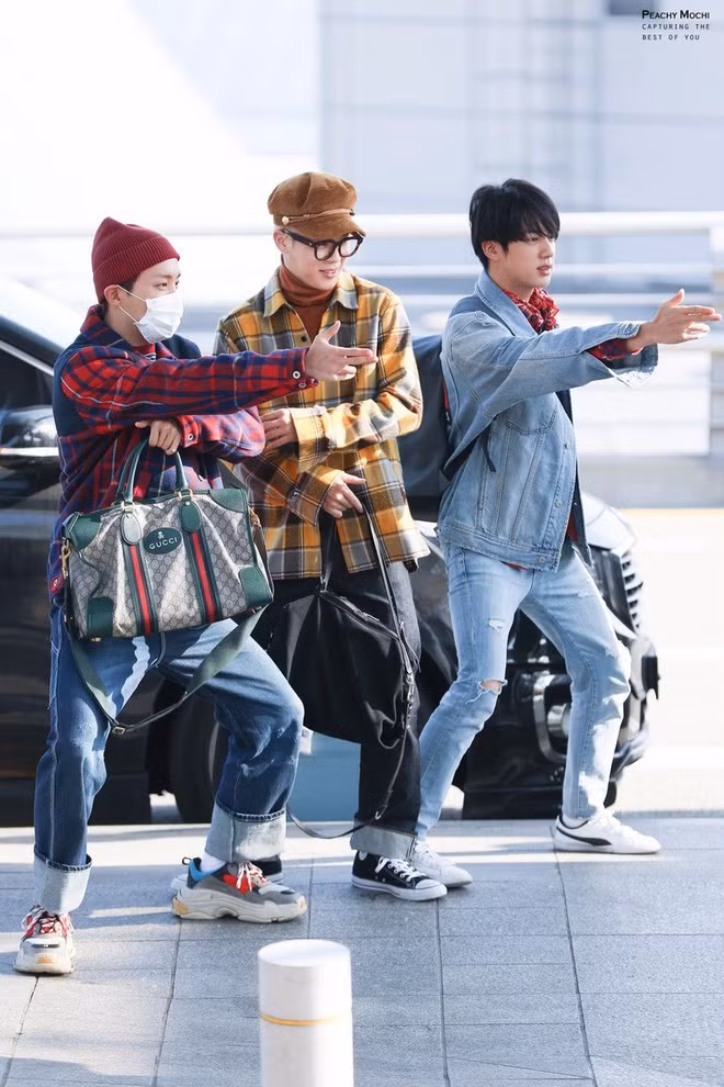 Thậm chí, ở ảnh phải, có lần Jin còn diện nguyên cây hanbok - trang phục truyền thống của Hàn Quốc - ra sân bay.