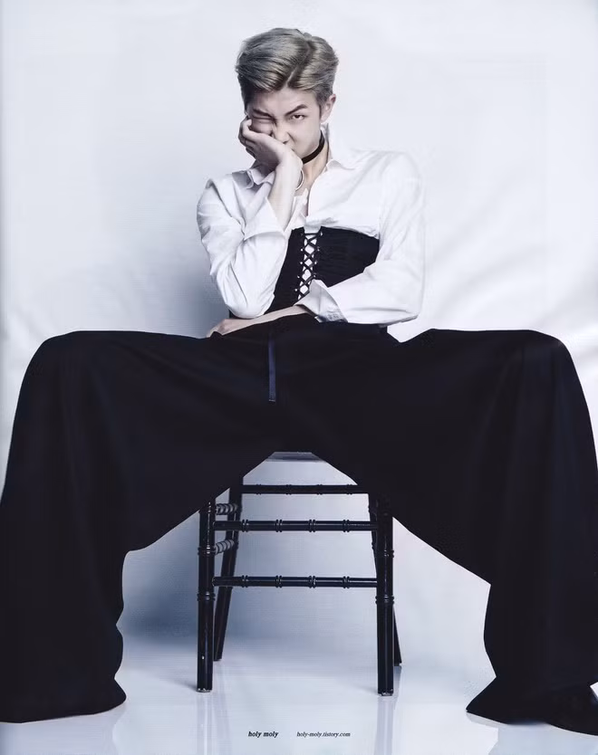 Trang phục màu sắc, hài hước vẫn là chưa đủ, những món đồ có phần nữ tính cũng được "gà" nhà Big Hit thử qua. Trưởng nhóm BTS từng khiến dân mạng bất ngờ khi diện corset vốn chỉ dành cho các chị em hay mặc quần ống rộng thùng thình, áo khoác ngoài dài như váy lên sân khấu.
