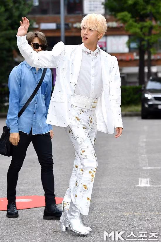 Thành viên Jin và V từng gây cười cho fan khi xuất hiện với set đồ "không giống ai" khi trên đường đến show âm nhạc. Anh cả nhóm BTS mặc cả cây suit thêu hoa, bên trong áo sơ mi cổ đính đá cầu kỳ và phối cùng boots màu bạc có gót. Outfit của 9X quá cầu kỳ và nữ tính, trông như tham gia buổi diễn nhạc kịch.
