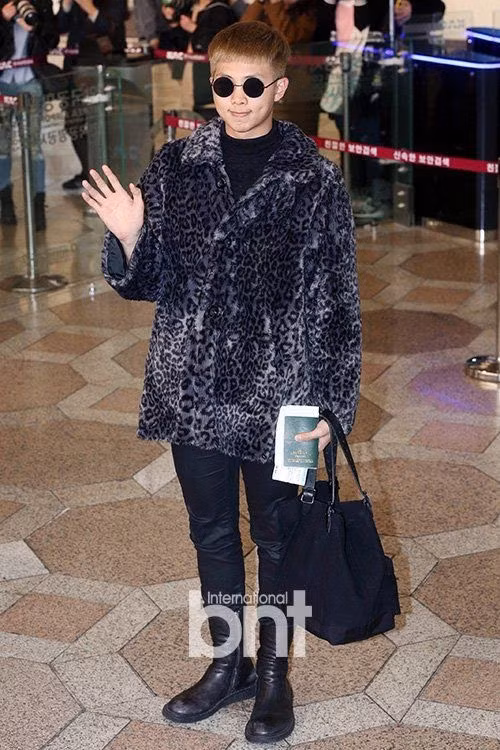 Anh mix thêm mẫu túi trong suốt, giày đế trong, đeo băng đô và cặp kính tròn lạ mắt. Trong khi đó, vẫn là cặp kính tròn hài hước, RM lại mặc áo khoác lông kén dáng.