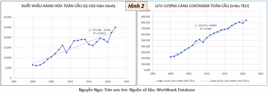 Hình 2 cho thấy sự tăng trưởng nhanh của xuất khẩu hàng hóa và lưu lượng cảng công-te-nơ toàn cầu trong 23 năm (2000-2022).