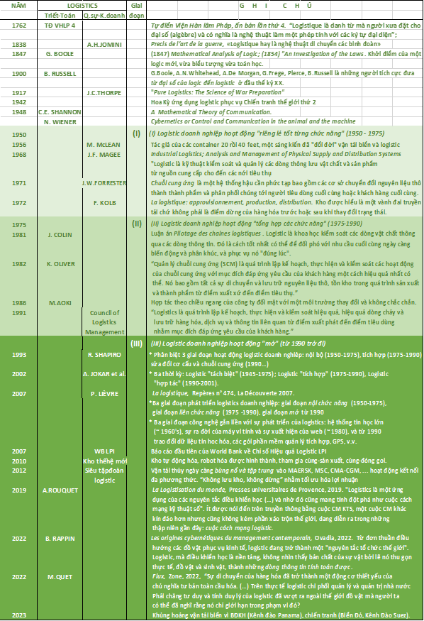 Cột 1 là các năm có định nghĩa hay ấn phẩm có liên quan đến định nghĩa logistic. Cột 2 là cột diễn tiến của định nghĩa theo hướng triết - toán học. Cột 3, diễn tiến của định nghĩa theo hướng quân sự-kinh doanh. Cột 4 ghi ở dòng tương ứng tên tác phẩm, nhà xuất bản, nội dung cô đọng theo nhận thức của tác giả.