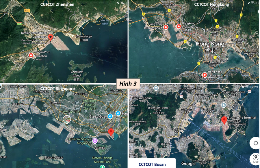 Đối với họ lợi ích kinh tế là hàng đầu. Đối với nước dự kiến xây CCTCQT, lợi ích cũng là kinh tế nhưng trước nhất cần làm rõ tính khả thi và không hy sinh môi trường[5]. Bảng 5 là năm CCTCQT hiện có ở Đông Á và Đông Nam Á mà cũng là năm CCTCQT bận rộn nhất thế giới. Ảnh vệ tinh cho thấy các cảng này đều tựa lưng vào núi và được xây dựng trên nền địa chất ổn định. Hình 3.