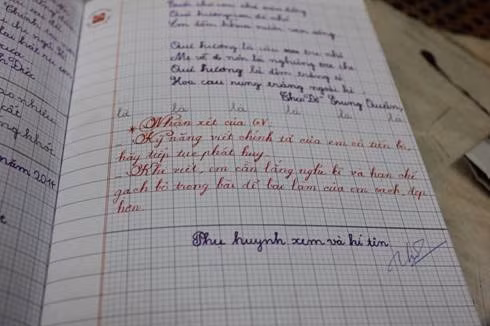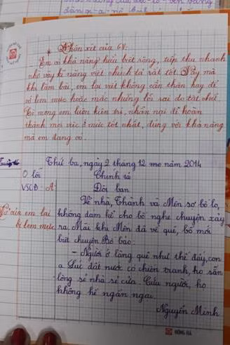 Qua một thời gian ngắn, thấy HS này tiến bộ, cô Oanh ghi lời phê như sau: “Em viết chính tả tiến bộ, trình bày sạch. Cô nhìn thấy sự cố gắng của em trong từng giờ học. Cô rất vui! Hãy tiếp tục rèn luyện, cố gắng hết sức mình để vươn lên trong học tập em nhé!”.