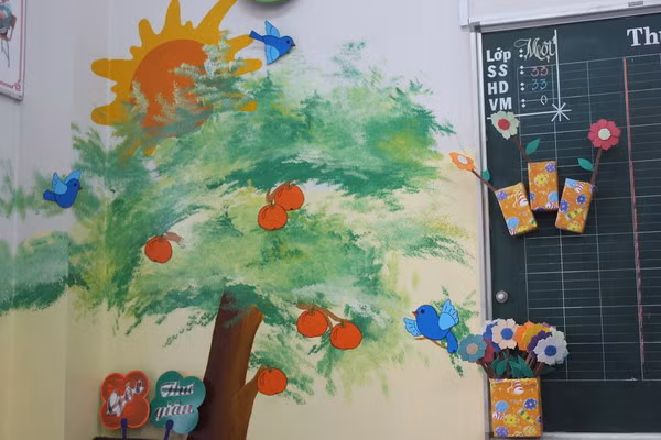 Về cách trang trí lớp học, cô Dung cho rằng, các em từ mẫu giáo lên, những hình vẽ xung quanh phòng cũng cần phải được đầu tư: vẽ hình cây, hình em bé đang cầm chùm bong bóng, chum hoa chẳng hạn.