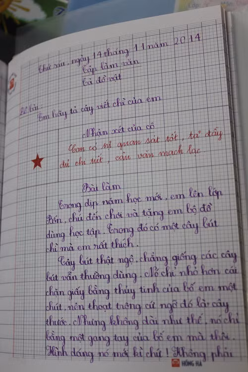 Theo quan sát một số tập vở của các em lớp 4/2, cụ thể ở môn Tập làm văn, HS làm bài tốt ngoài lời nhận xét: Con viết bài cẩn thận, cần chú ý quan sát thêm cô Châu cho thêm hình mặt cười. Ở lời nhận xét này sẽ khác với lời nhận xét của HS khác: Con có sự quan sát tốt, tả đầy đủ chi tiết, câu văn mạch lạc, cộng thêm hình ngôi sao.