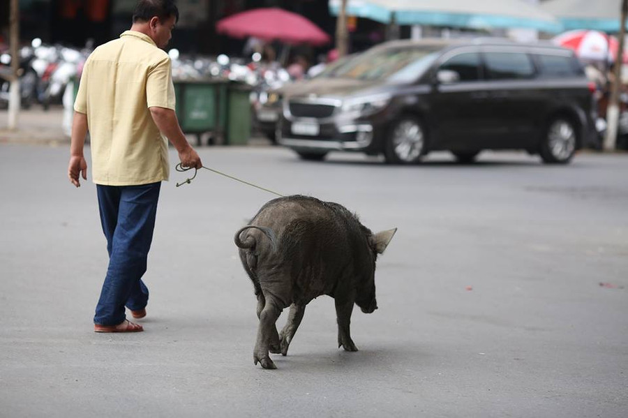 Nhóm người này đuổi theo con lợn đến đoạn vỉa hè Khách sạn Nikko trên đường Lê Duẩn mới bắt được.
