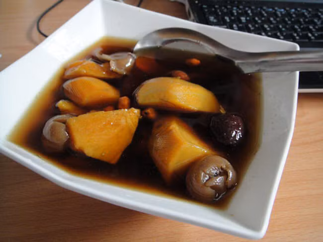 – Hạt sen + nấm trắng + đường phèn + táo đỏ + long nhãn (hầm trong nửa giờ)