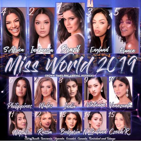 Chuyên trang sắc đẹp Missosology đã có sự quan sát và đánh giá chính thức sau thời gian nhập cuộc Miss World của 120 đại diện trên khắp Thế giới và đưa ra bảng dự đoán mới nhất của mình.
