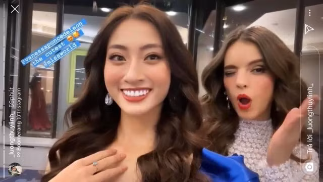 Lương Thùy Linh còn khiến fan thích thú khi cùng trò chuyện và chụp ảnh với Miss World 2018, Hoa hậu Vanessa Ponce.