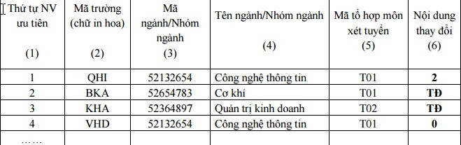 Nếu chỉ thay đổi thứ tự NV ưu tiên và giữ nguyên các nội dung khác đã đăng kí thì thí sinh ghi số thứ tự NV ưu tiên cũ tại cột (6) cùng hàng;