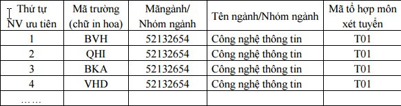 Ví dụ: Bảng danh sách nguyện vọng cũ đã đăng kí khi làm thủ tục dự thi (bảng cũ):