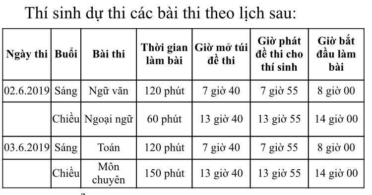 Cụ thể giờ phát đề, Sở quy định, buổi sáng là 7 giờ 55 và buổi chiều là 13 giờ 55. Mỗi buổi thi, thí sinh có mặt tại phòng thi đúng thời gian quy định. Thí sinh đến chậm quá 15 phút sau khi có hiệu lệnh tính giờ làm bài sẽ không được dự thi buổi thi đó.