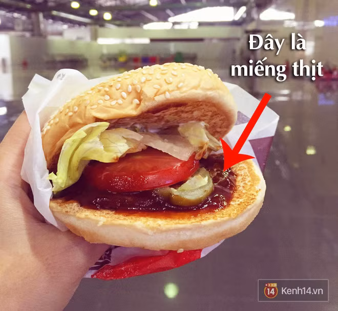 Cả miếng thịt trong hình quảng cáo to thế, nhưng khi nhận được burger thì tìm mỏi mắt mới thấy chút thịt dẹp lép bên trong...