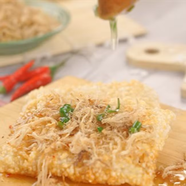 Làm nóng dầu rồi cho 50gr hành lá vào là ta đã có chén mỡ hành thơm ngon. Đợi cơm cháy sau khi chiên xong rưới nước mắm mặn ngọt, thêm chà bông, ruốc, mỡ hành lên rồi thưởng thức. Cơm cháy vàng rụm thơm mùi nếp mặn mặn của chà bông sẽ khiến bạn ăn mãi không dừng.