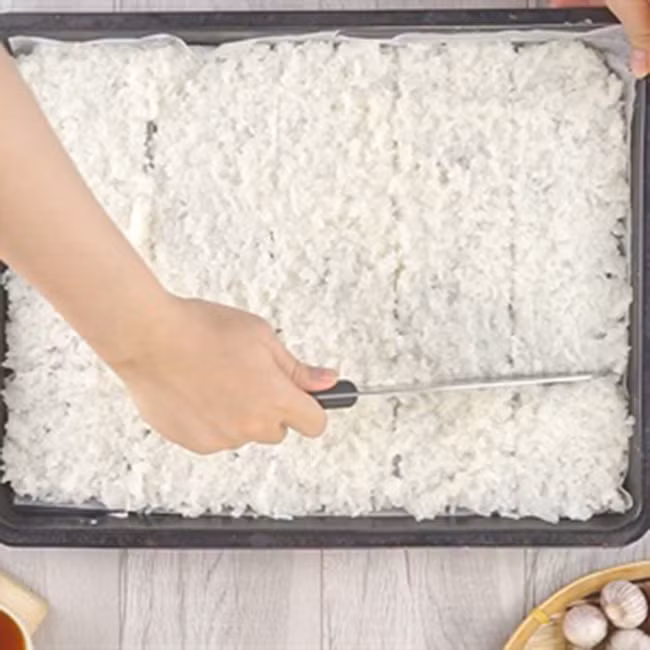 Nếp sau khi hấp chín đem dàn đều ra khay khoảng 1cm rồi cắt thành những hình chữ nhật nhỏ. Đem nướng 150 độ trong 90 phút cho nếp khô hoàn toàn.