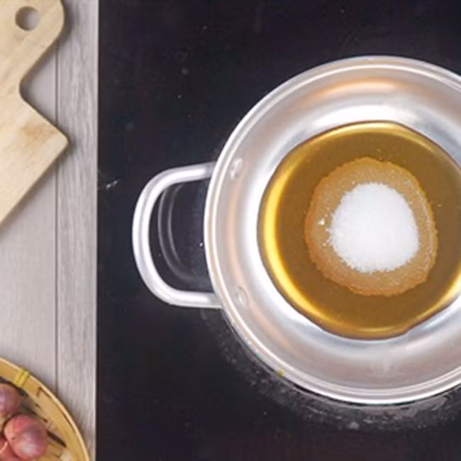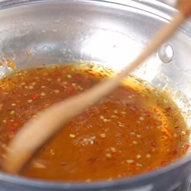 Nấu sôi 4 muỗng canh đường và 5 muỗng canh nước mắm đến khi sôi rồi mới cho 1 muỗng cà phê ớt xay vào và tắt lửa.