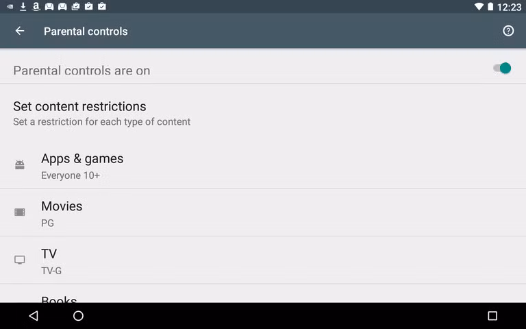 Sau khi bật Parental controls, bạn có thể vào mỗi phần để bật hạn chế. Với Books and Musics, bạn có thể hạn chế các nội dung người lớn. Apps, Games, Movies và TV bạn sẽ hạn chế theo độ tuổi.
