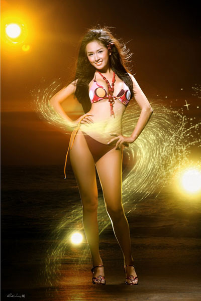 Trong trang phục hai mảnh, Hoa hậu Việt Nam 2006 để lộ đôi chân dài miên man, vòng eo nhỏ và bộ ngực tròn đầy từng khiến dư luận nghi ngờ có sự can thiệp của dao kéo.