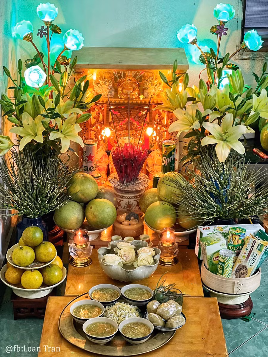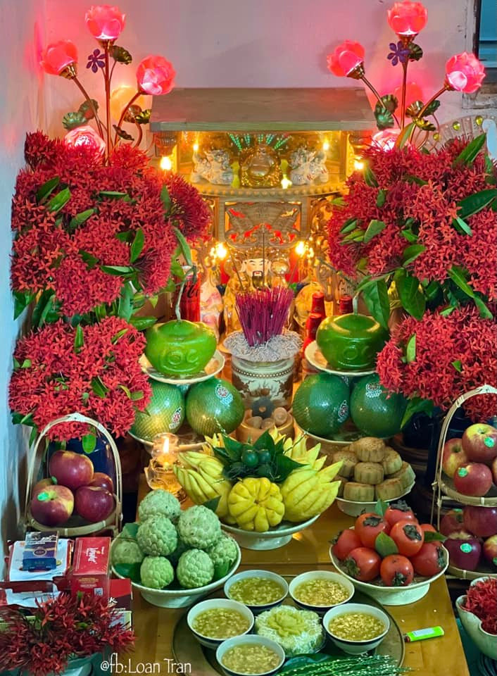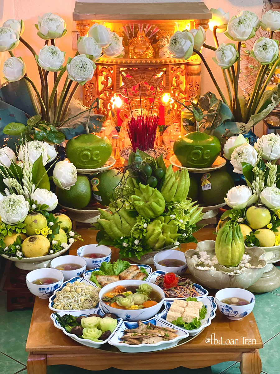 Có thể thấy trong mâm cỗ nhà chị Loan có đầy đủ các món gồm có thịt heo (khúc thịt heo luộc hoặc quay tượng trưng cho vật sống trên cạn (loài thai sinh), 3 con tôm hoặc 1 con cua luộc chín đại diện cho vật sống dưới nước (loài thấp sinh) và 1 hoặc 3 quả trứng luộc tượng trưng cho vật thuộc hệ lông vũ bay trên trời (loài noãn sinh)...