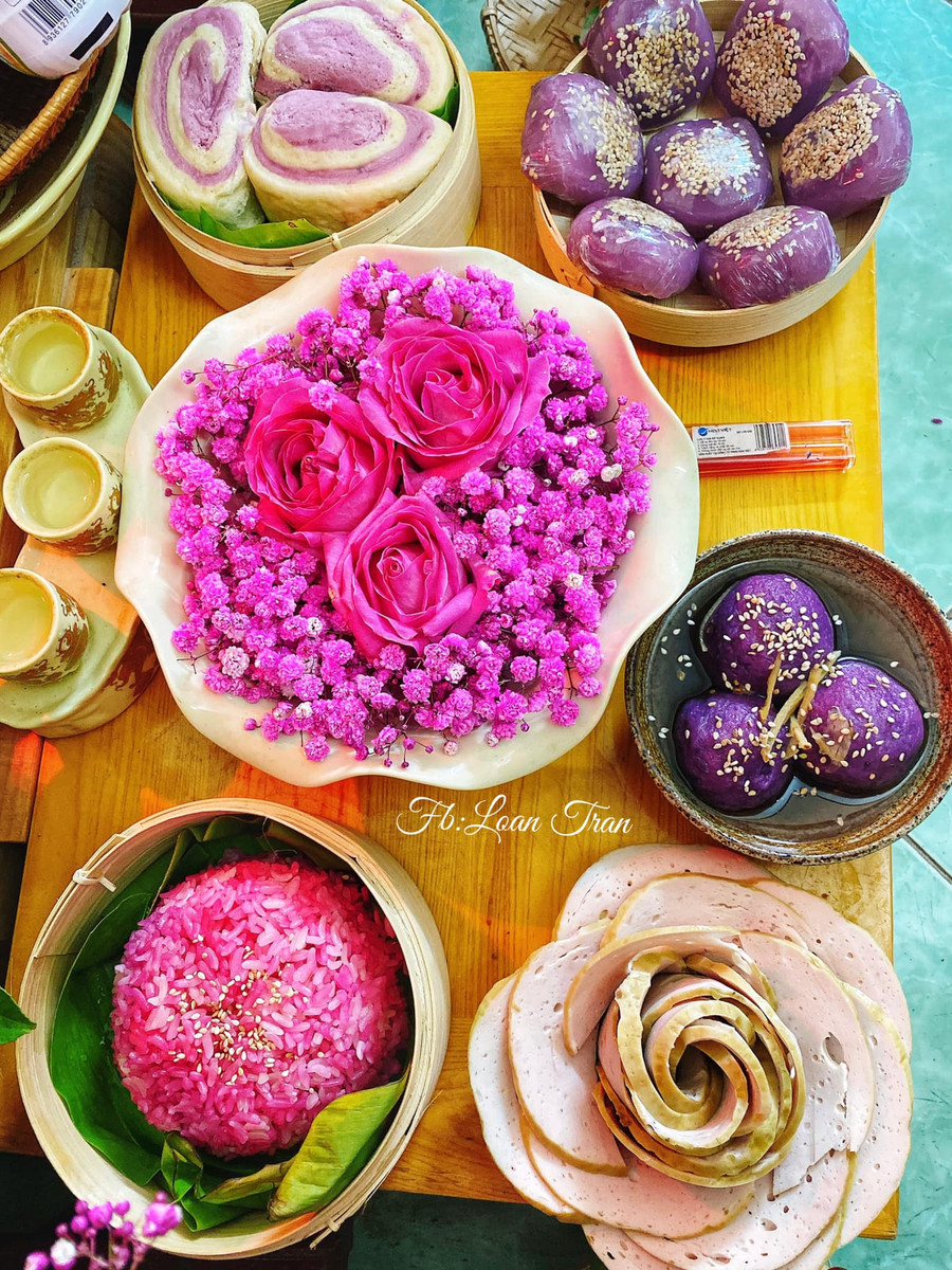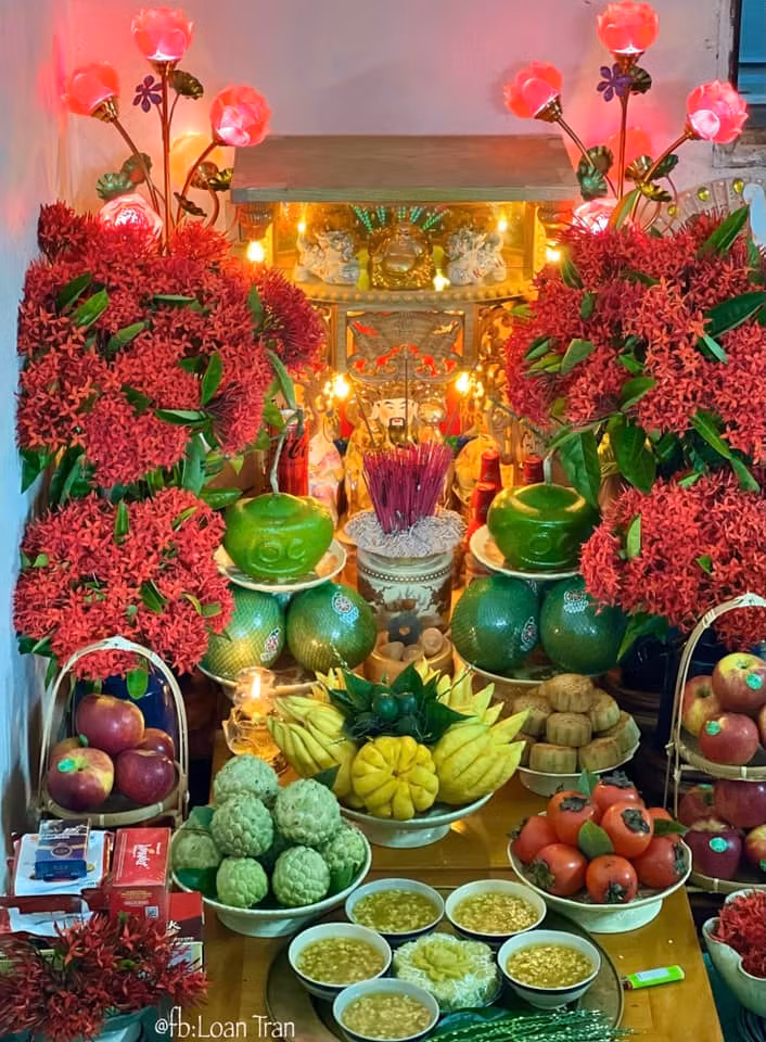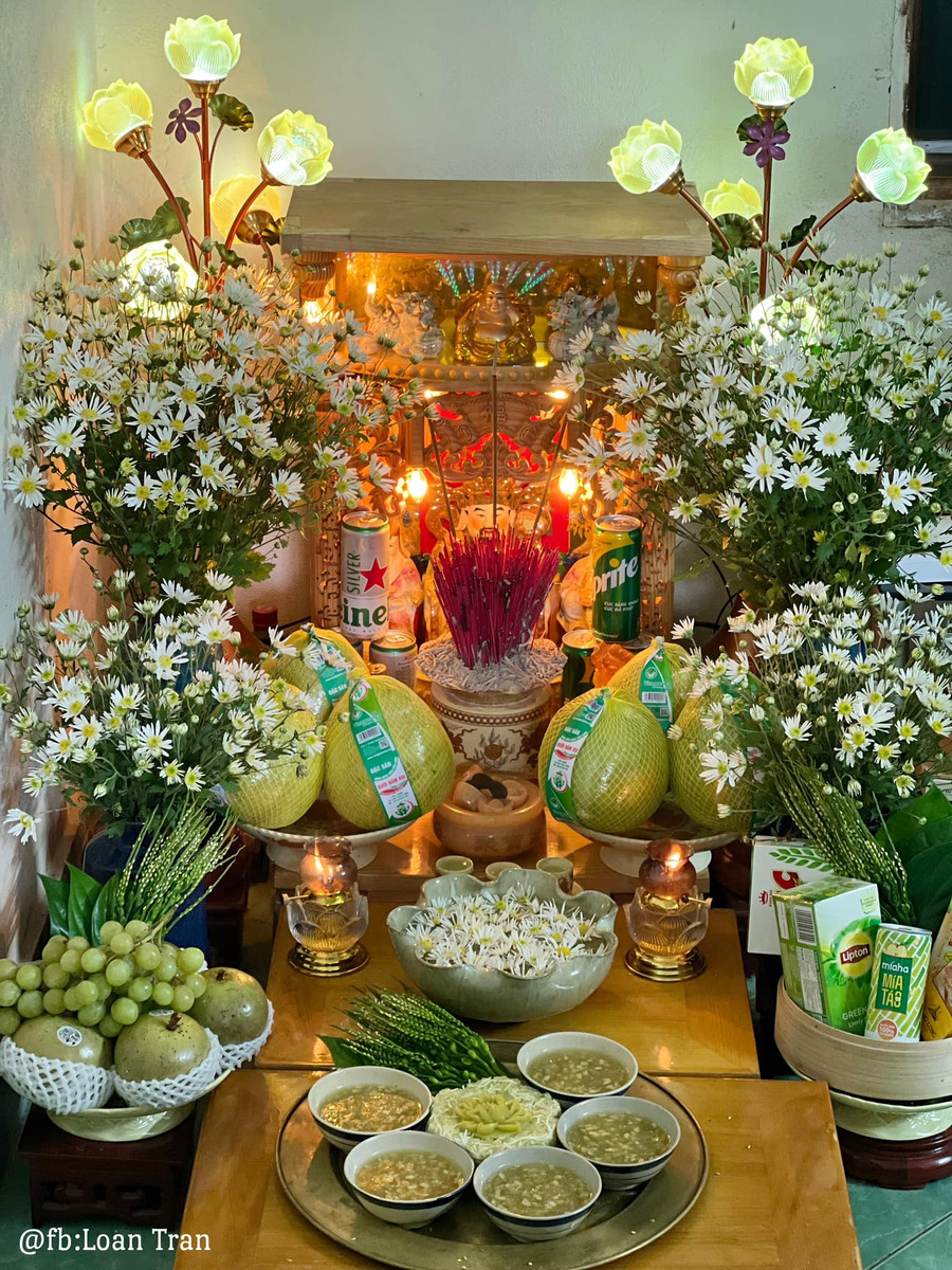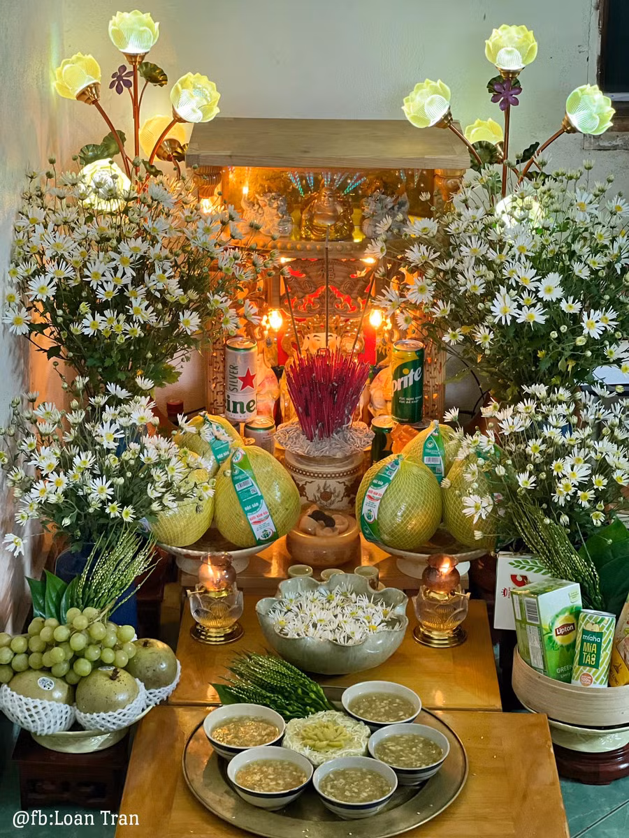 Có thể thấy trong mâm cỗ nhà chị Loan có đầy đủ các món gồm có thịt heo (khúc thịt heo luộc hoặc quay tượng trưng cho vật sống trên cạn (loài thai sinh), 3 con tôm hoặc 1 con cua luộc chín đại diện cho vật sống dưới nước (loài thấp sinh) và 1 hoặc 3 quả trứng luộc tượng trưng cho vật thuộc hệ lông vũ bay trên trời (loài noãn sinh)...