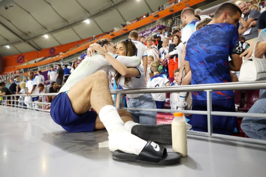 | Tiền vệ Jack Grealish ôm bạn gái Sasha Attwood sau trận Anh thắng Iran 6-2. |