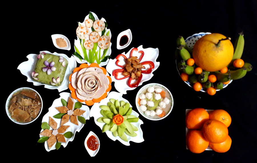 | Mâm cỗ chay: Gỏi cuốn ngũ sắc chấm sốt bơ lạc hành phi, nem nấm chiên, xôi hoa đậu biếc đậu xanh ruốc nấm hương, súp lơ xào nấm ngô ngọt, nem nấm trộn thính, canh nấm ngô ngọt, chè hoa cau. |