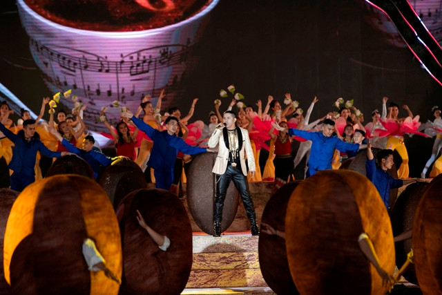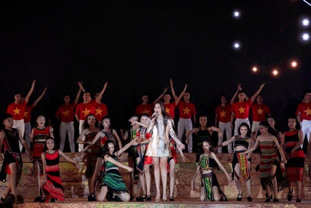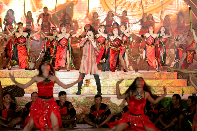Diện một chiếc áo dài hoa văn thổ cẩm, nam ca sĩ Tuấn Hưng với giọng hát đầy nội lực của mình đã thổi bùng hồn lửa đại ngàn với bài hát “Ngọn lửa cao nguyên”.