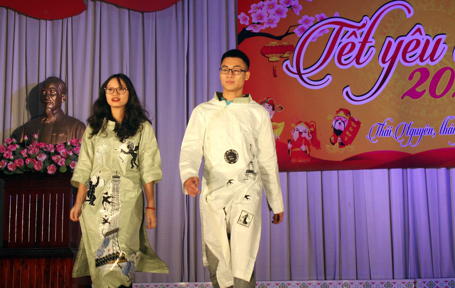 | Tiết mục biểu diễn thời trang mang chủ đề "Môi trường xanh" của các em học sinh trường THPT Thái Nguyên |