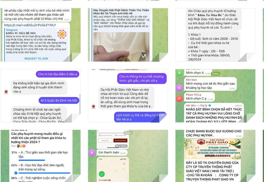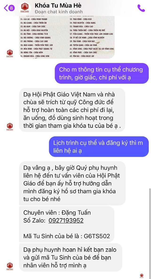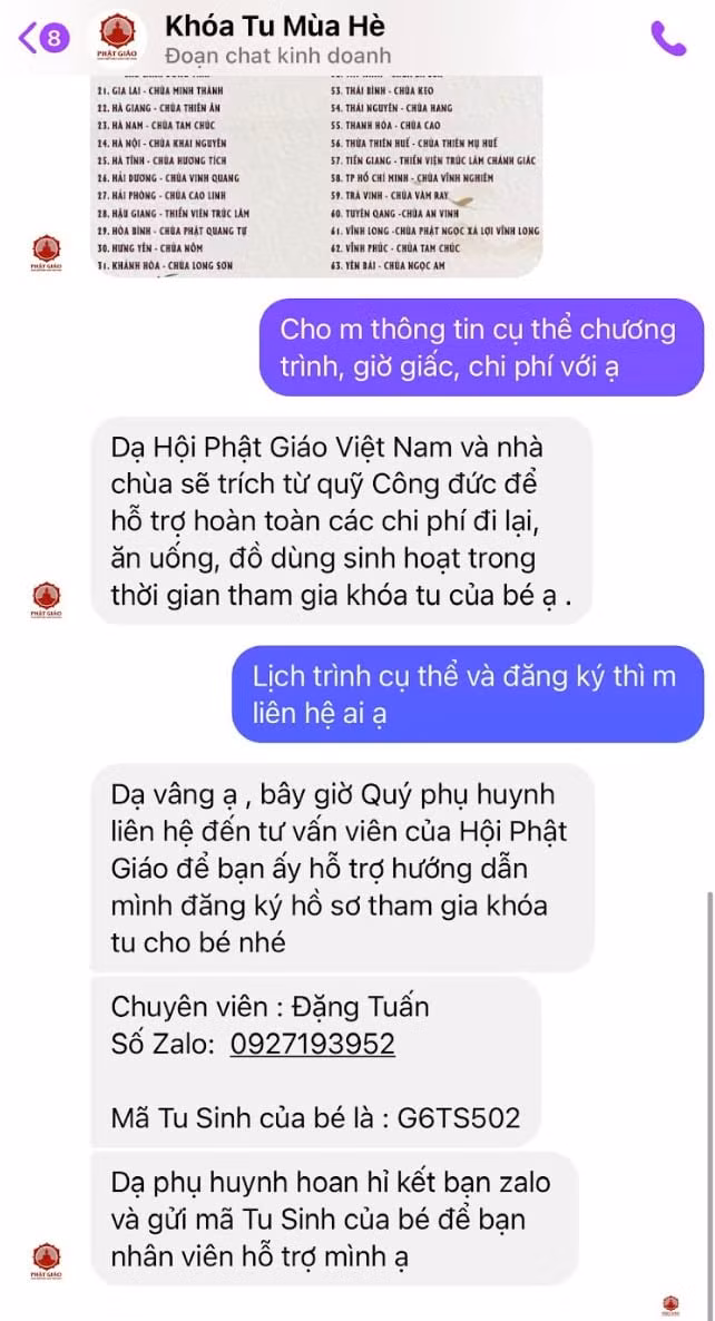 Tôi xin trình báo một việc xảy ra ngày hôm nay (06/3/2024) liên quan tới vụ việc mà tôi nhận định là lừa đảo của 1 nhóm người có tổ chức gây ảnh hưởng tới hình ảnh của Giáo hội Phật giáo Việt Nam. Ngày hôm nay khi đăng nhập Facebook tôi có kết nối với 1 trang web có tên là "Khóa tu mùa hè". Với nhu cầu cho con được tham gia khóa tu nên tôi đã hỏi bên đó về trình tự thủ tục đăng ký. Họ cung cấp cho tôi Mã tu sinh và số điện thoại của 1 người tên Đặng Tuấn (số điện thoại: 0927193952).