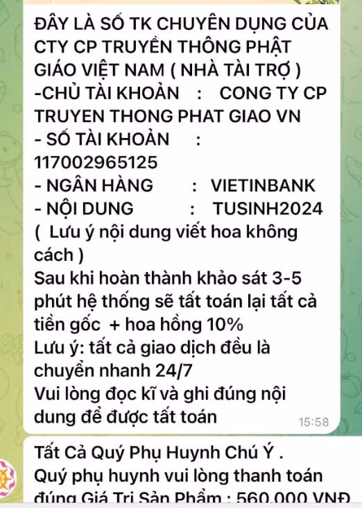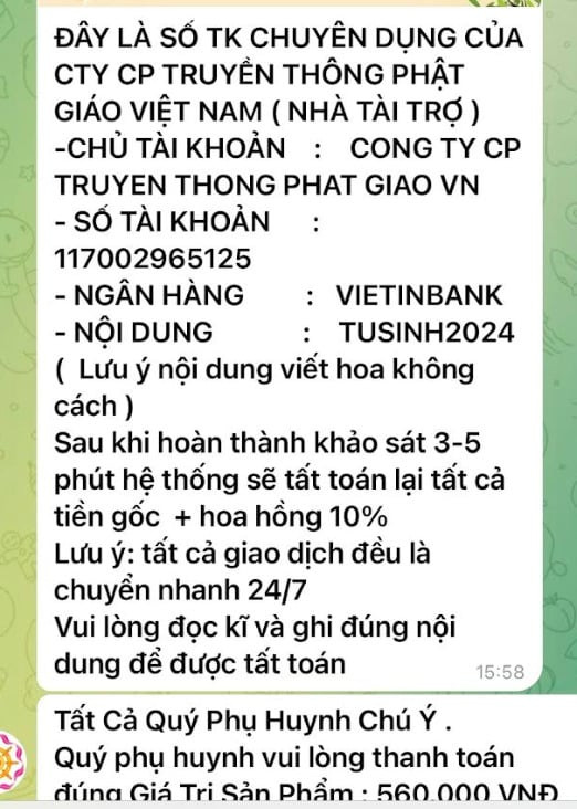 Sau khi liên hệ Zalo thì người này chuyển sang Telegram để nhắn tin hoạt động của nhóm. Trong nhóm có 33 thành viên. Họ yêu cầu làm các bước khảo sát và cuối cùng họ hướng dẫn là chuyển khoản tiền cho bên thứ 3 với cái tên Công ty CP truyền thông Phật giáo Việt Nam (số tài khoản như ảnh) với lý do đẩy mạnh tương tác cho Vật phẩm Phật giáo, đẩy mạnh hoạt động của nhà tài trợ.