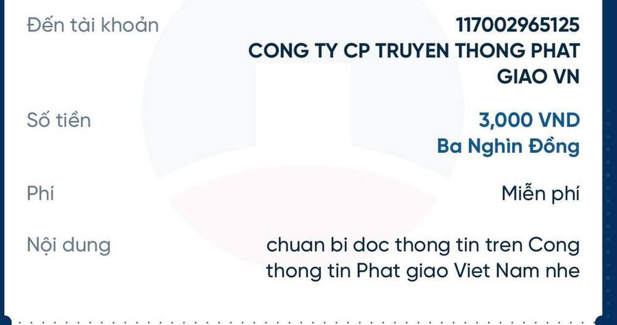 Trong số các hình ảnh kêu gọi chuyển tiền, có số tài khoản 11700296 5125 tại Vietinbank của "Công ty CP Truyền thông Phật giáo VN" (khác nhau từ cuối cùng).