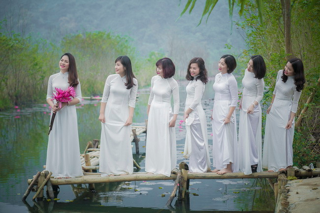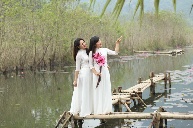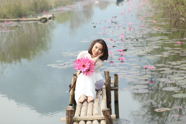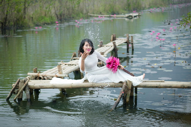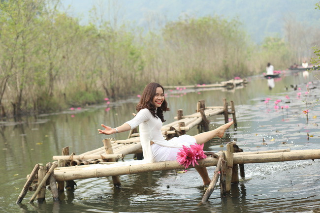 Với trang phục áo dài truyền thống hay tân thời, bạn đều có thể chớp cho mình những bức ảnh đẹp. Nhưng có lẽ sự kết hợp giữa tà áo dài trắng thướt tha với sắc tím hồng của hoa súng sẽ đẹp hơn cả. Giữa bối cảnh xung quanh dòng suối là núi non, mây trời thì màu trắng tinh khôi của tà áo dài sẽ cho bạn những bức ảnh thơ mộng ngỡ như đang lạc giữa chốn bồng lai tiên cảnh.
