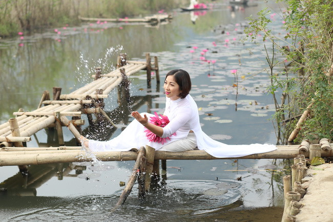 Suối Yến (hay còn gọi là Yến Vĩ) chảy ra sông Đáy, nằm trong địa phận xã Hương Sơn, huyện Mỹ Đức, Hà Nội. Xin giới thiệu bộ ảnh đẹp với tà áo dài trắng thướt tha bên dòng suối Yến tím hồng thơ mộng khi đang mùa hoa súng nở của hai nhiếp ảnh trẻ Nguyễn Trường Nam và Hồng Phong