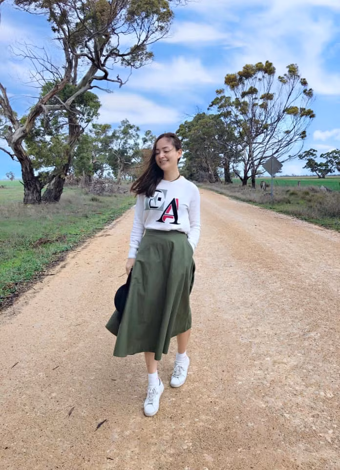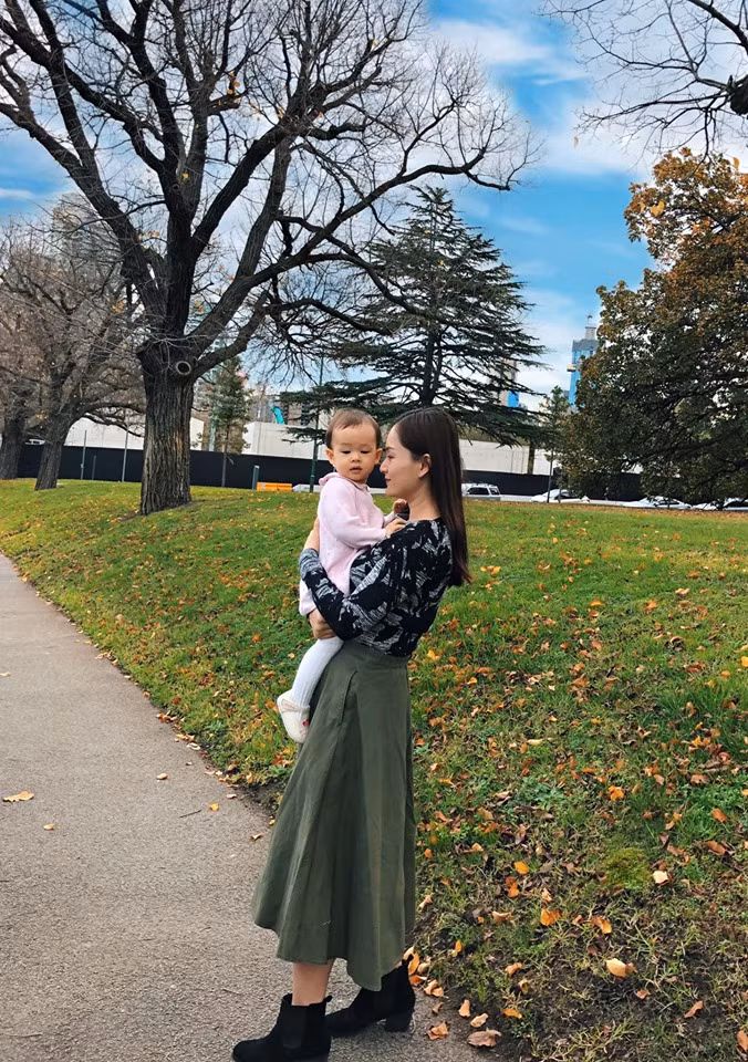 Mới đây, cô và gia đình đã có chuyến thăm ông bà nội của con gái ở bên Úc. Hầu hết, bên trời Tây, diễn viên Lan Phương đều chọn phóng cách chân váy midi dáng dài với áo thun bó sát hoặc sơ mi.