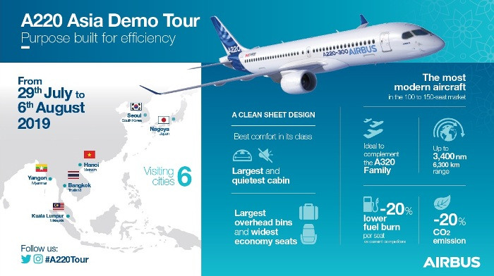 Sáng nay (29/7), đại diện của Airbus cho biết, chiếc máy bay bay Airbus A220-300 sẽ thực hiện tour trình diễn tại Châu Á. Trong hành trình này, A220-300 sẽ dừng chân tại 6 địa điểm trong hành trình bay trình diễn tại khu vực châu Á.