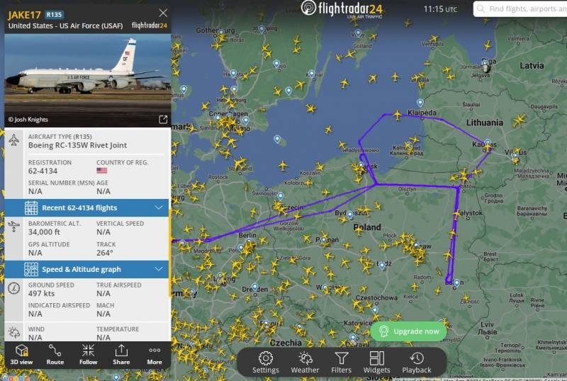 Cụ thể, máy bay trinh sát điện tử và kỹ thuật vô tuyến chiến lược RC-135W Rivet Joint của Anh với số hiệu JAKE17, xuất phát từ căn cứ không quân Mildenhall đang bay qua khu vực biên giới, nó tính toán vị trí các hệ thống phòng không và trạm liên lạc kỹ thuật của Nga và Belarus ở độ sâu 500 km.