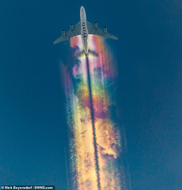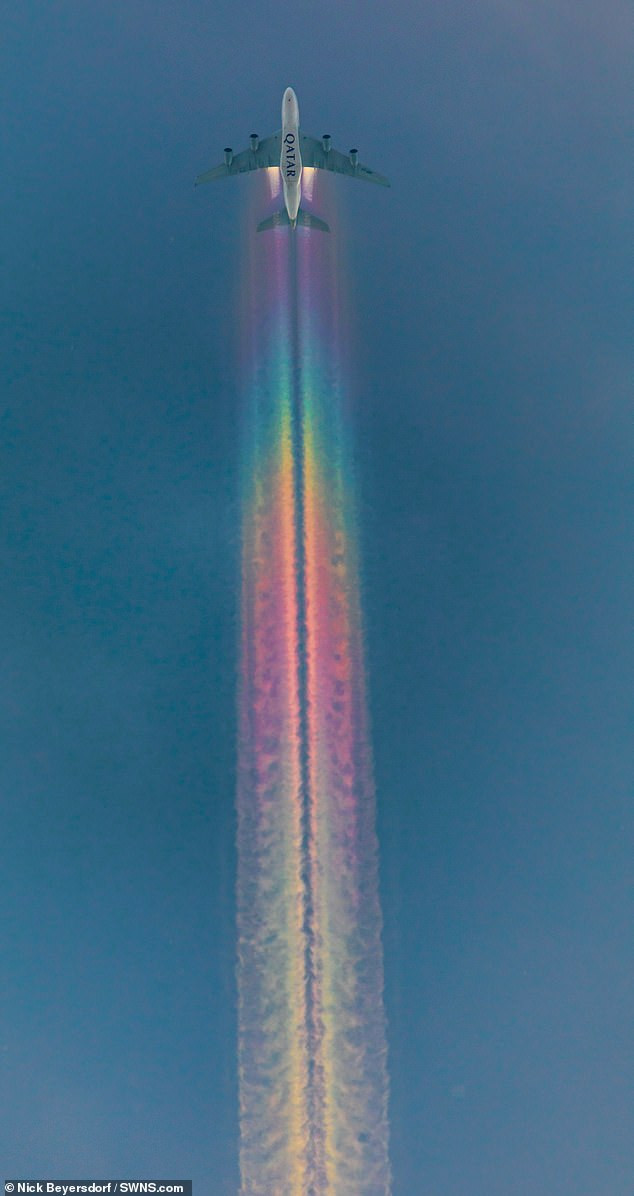 “Thật tuyệt khi 600 tấn nhôm có thể bay cao như thế phía trên đầu bạn. Do điều kiện khí quyển, máy bay đã tạo ra một vệt phía sau cánh của nó. Cũng nhờ góc của Mặt trời nên vệt ánh sáng đó phản chiếu ánh sáng, tạo ra hiệu ứng cầu vồng” – Beyersdorf giải thích.