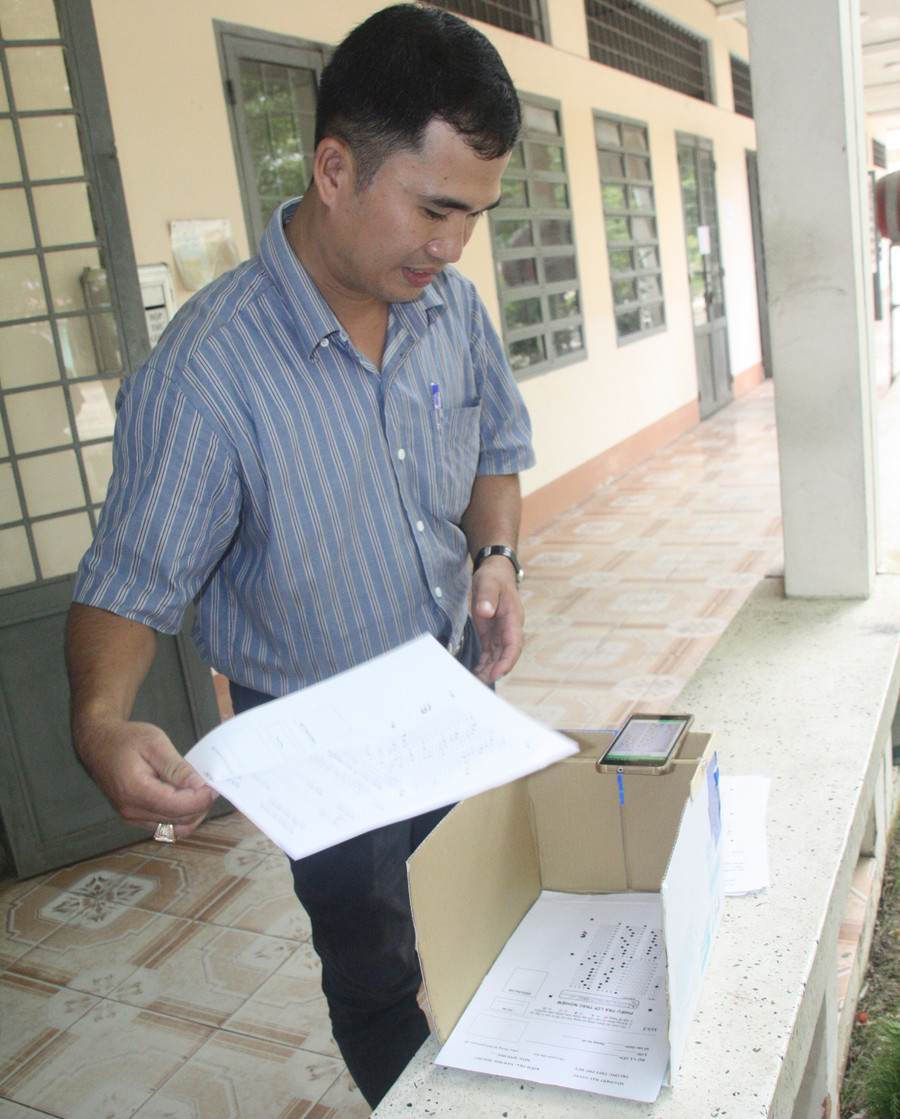 Về nguyên lý hoạt động của dụng cụ chấm thi trắc nghiệm, thầy Cường cho biết: Bộ dụng cụ khá đơn giản, gồm: một smartphone có camera, một thùng đựng giấy A4 rỗng, một thanh để kê điện thoại bên trên. Khi chấm bài thi, người dùng chỉ cần bật phần mềm lên, đưa bài vào thùng thì camera sẽ quét, giáo viên chỉ việc ghi kết quả lại. Hình ảnh các bài thi đã chấm được lưu lại, đáp án nào đúng, đáp án nào sai, đều được sao lưu. Sau đó được trình chiếu lại cho học sinh xem trong tiết sửa bài thi hôm sau, đảm bảo tính khách quan và hiệu quả.