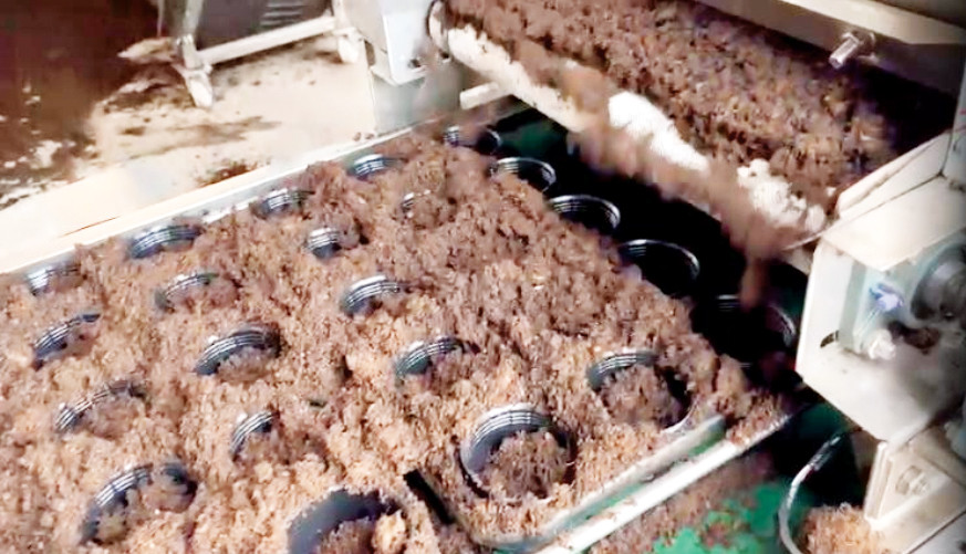 Sau khi hoàn thành công đoạn đục lỗ, công nhân sẽ thực hiện thao tác trồng cây con vào ly ở các khay được di chuyển ra ngoài. Toàn bộ hệ thống được hoạt động tự động theo nguyên lý khí nén, cơ học và chương trình phần mềm điện tử.