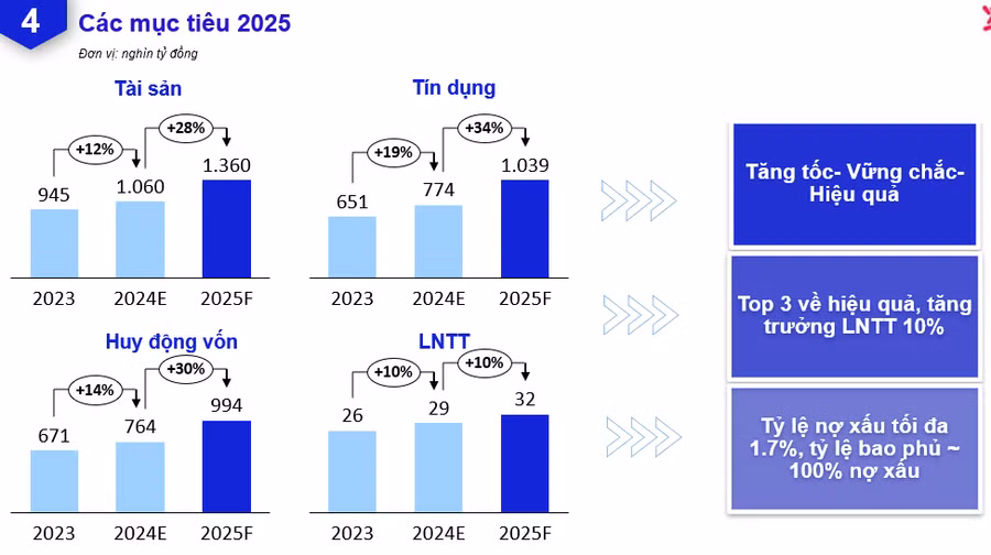 Kế hoạch ước tính tổng tài sản năm 2025 đạt trên 1.3 triệu tỷ đồng (tăng 22%), tín dụng và huy động vốn đều đặt kế hoạch trên 1 triệu tỷ đồng (tăng lần lượt 26% và 25%).