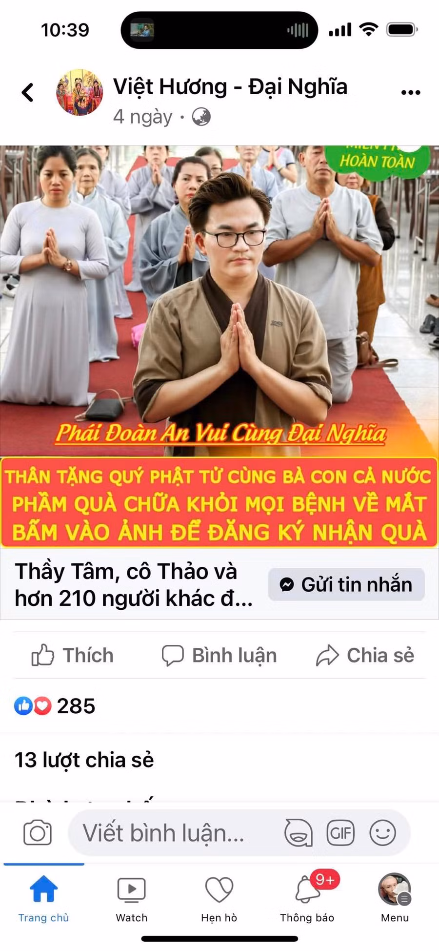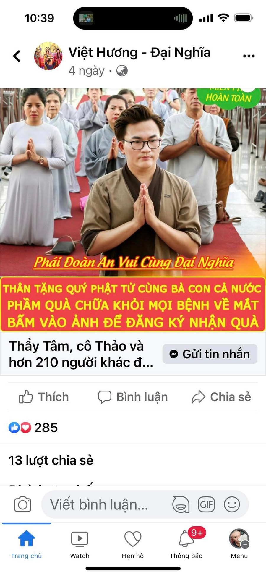 Nam MC viết: "Sao họ có thể làm cái điều trơ trẽn đến mức như vậy chứ nhỉ? Nhiều người đã nhắn hỏi Nghĩa về việc này, khi nhắn cho trang này vì thấy là “Đại Nghĩa- Việt Hương tặng thuốc miễn phí”, nhưng khi gọi đến thì họ yêu cầu phải chuyển tiền này tiền kia đủ thứ mới được nhận (mà thuốc đó là thuốc gì, từ đâu ra chắc chỉ có trời mới biết).